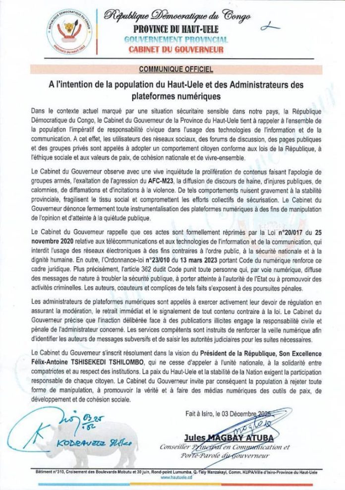 Dans un communiqué officiel signé par son porte-parole, Jules Magbay Atuba, le Cabinet du Gouverneur du Haut-Uele appelle la population et les administrateurs des plateformes numériques à la responsabilité civique dans un contexte sécuritaire jugé sensible.